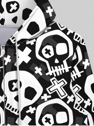 Gothic Skulls Cross Print Two Tone Zip Up Pockets Hoodie For Men - Black - 3xl