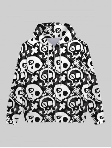 Gothic Skulls Cross Print Two Tone Zip Up Pockets Hoodie For Men - Black - 4xl