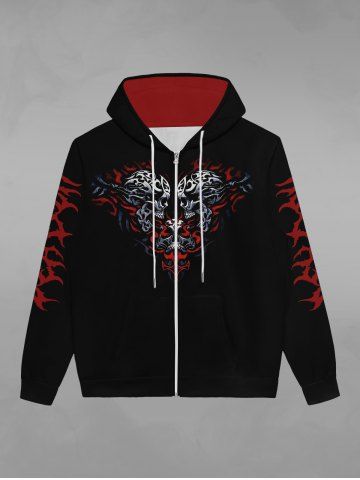 Gothic Skulls Flame Print Pockets Drawstring Zip Up Hoodie For Men - Black - 5xl