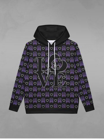 Gothic Skulls Heart LOVE Letter Print Pockets Fleece Lining Drawstring Hoodie For Men - Black - L