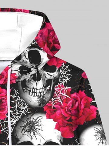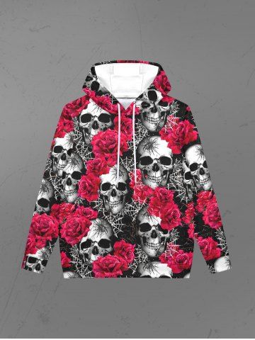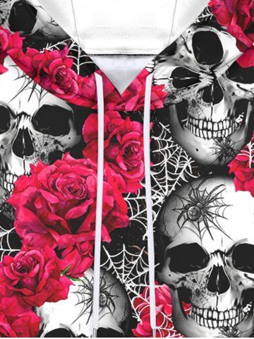 Gothic Skulls Rose Flower Spider Web Print Fleece Lining Drawstring Hoodie For Men - Multi-a - M