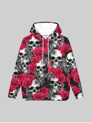 Gothic Skulls Rose Flower Spider Web Print Fleece Lining Drawstring Hoodie For Men - Multi-a - 2xl