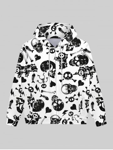 Gothic Skulls Skeleton Fish Bone Heart Print Pockets Zip Up Hoodie For Men - White - 3xl