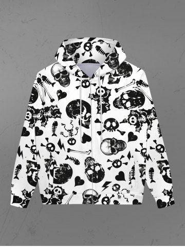 Gothic Skulls Skeleton Fish Bone Heart Print Pockets Zip Up Hoodie For Men - White - 4xl