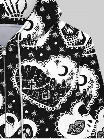 Gothic Skulls Skeleton Heart Cross Lip Moon Tombstone Ghost Print Zipper Pocket Drawstring Valentines Hoodie For Men - Black - 4xl