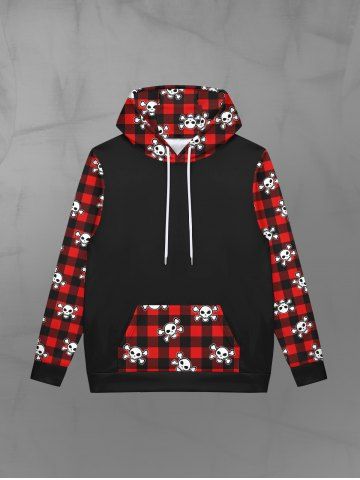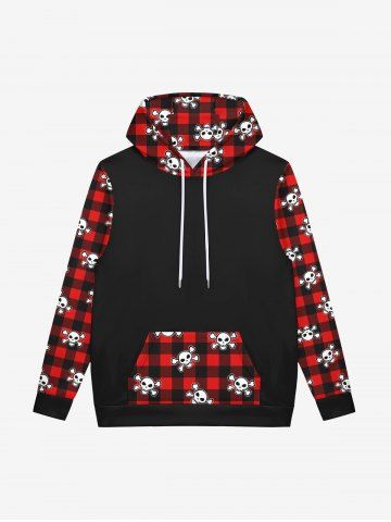 Gothic Skulls Skeleton Plaid Checkered Print Pockets Fleece Lining Drawstring Hoodie For Men - Black - M