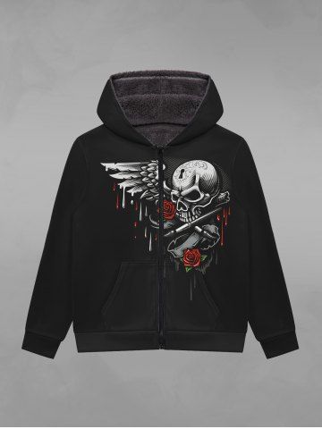 Gothic Skulls Wing Bloody Rose Flower Print Pocket Zipper Fleece Lining Hoodie For Men - Black - S
