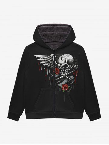 Gothic Skulls Wing Bloody Rose Flower Print Pocket Zipper Fleece Lining Hoodie For Men - Black - 2xl