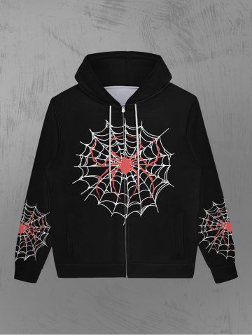 Gothic Spider and Spider-Web Print Halloween Zipper Drawstring Hoodie For Men - Black - 4xl