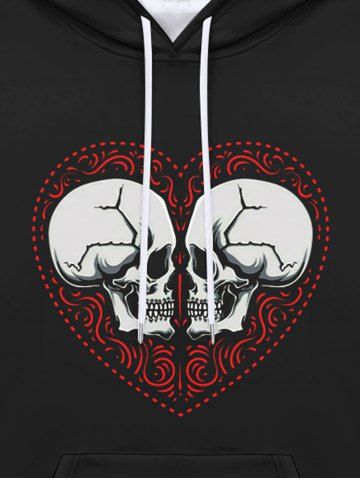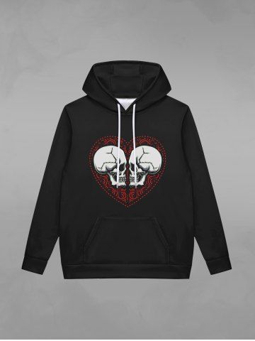Gothic Valentine's Day Heart Skulls Print Pockets Fleece Lining Drawstring Hoodie For Men - Black - 5xl