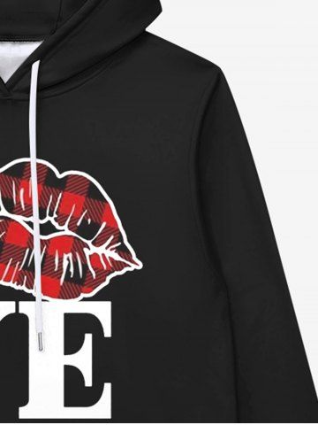 Gothic Valentine's Day Plaid Lip LOVE Letters Print Pockets Fleece Lining Drawstring Hoodie For Men - Black - M