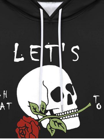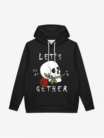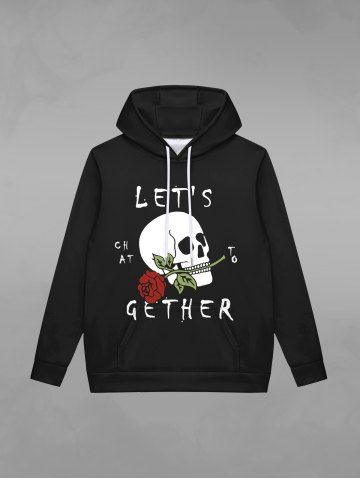 Gothic Valentine's Day Rose Flower Skull Print Pockets Fleece Lining Drawstring Hoodie For Men - Black - 2xl