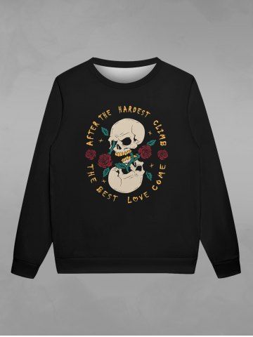 Gothic Valentine's Day Skull Rose Flowers Print Crew Neck Sweatshirt For Men - Black - Xl