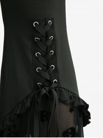 Skull Stars Flocking Lace Up Pocket Patchwork Flare Pants - Black - M