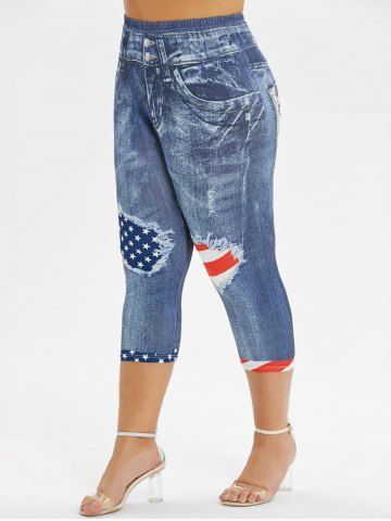 Plus Size 3D Ripped Patriotic American Flag Pocket Denim Print Capri Leggings - Blue - 3x