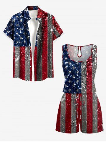 Patriotic Leginggs & Pants > Plus Size Glitter Sequins Patriotic American Flag Print Drawstring Pocket Romper