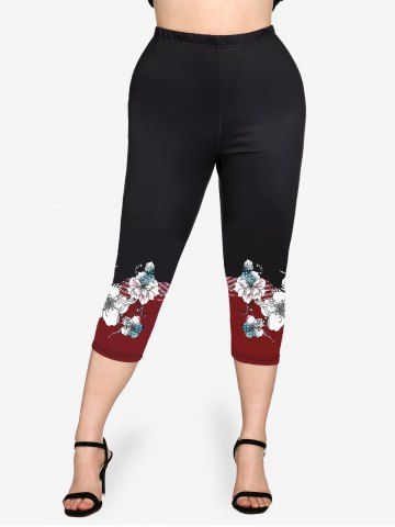 Plus Size Patriotic Flower American Flag Printed Capri Leggings - Deep Red - S | Us 8