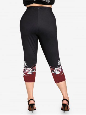 Plus Size Patriotic Flower American Flag Printed Capri Leggings - Deep Red - 1x | Us 14-16