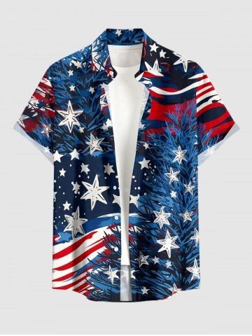 Plus Size Patriotic American Flag Christmas Tree Print Button Pocket Shirt For Men - Deep Blue - M