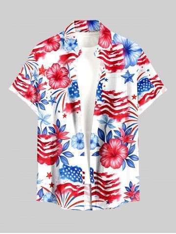 Patriotic Men > Plus Size Patriotic American Flag Fireworks Hibiscus Flowers Print Buttons Pocket Shirt For Men