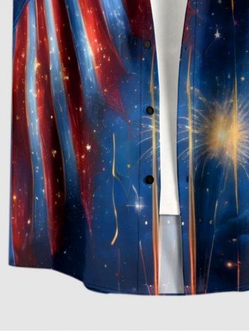 Plus Size Patriotic American Flag Fireworks Oil Painting Print Buttons Pocket Shirt For Men - Deep Blue - L