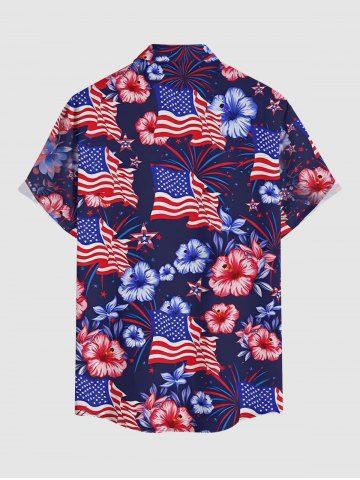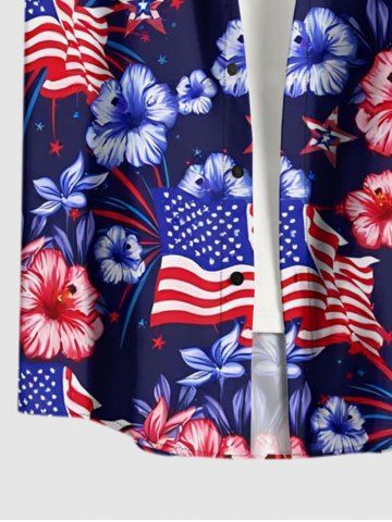 Plus Size Patriotic American Flag Hibiscus Flower Print Buttons Pocket Shirt For Men - Deep Blue - M