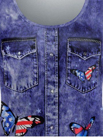 Plus Size 3D Butterfly American Flag Pockets Buttons Denim Print Short Sleeve T-Shirt - Blue - 4x | Us 26-28
