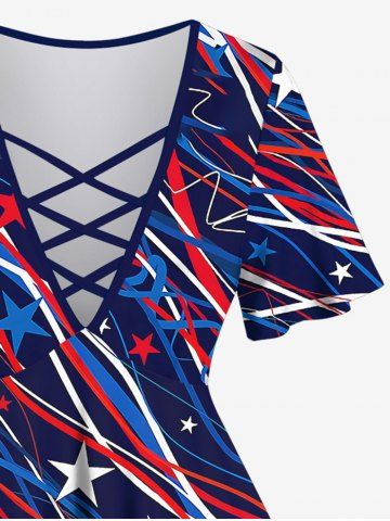 Plus Size American Flag Star Stripes Print Lattice Crisscross Flare Sleeve T-shirt - Blue - 3x