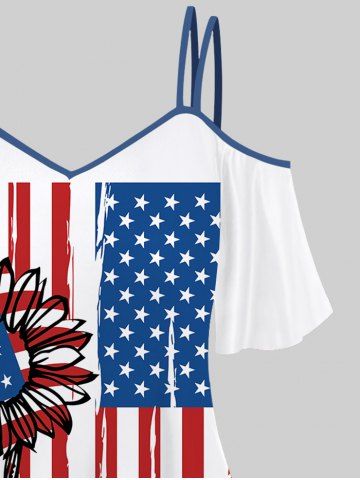Plus Size Cold Shoulder Sunflower Patriotic American Flag Strip Printed T-shirt - White - Xs