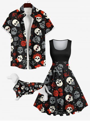 Pet's Skulls Hat Bowknot Rose Flowers Print Shirt - Black - M