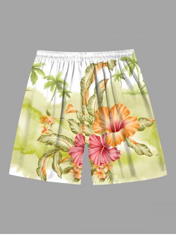 Plus Size Coconut Tree Tropical Leaf Hibiscus Flowers Print Hawaii Beach Shorts For Men - Green - 7xl