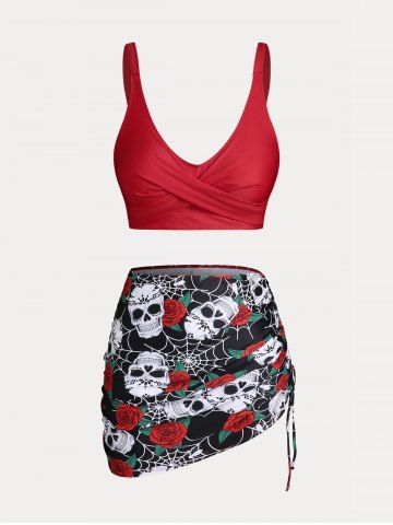 Plus Size & Curve Skull Rose Print Crossover Three Piece Bikini Swimsuit - Multi - 5x