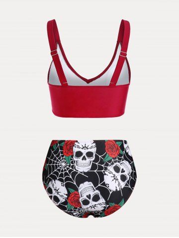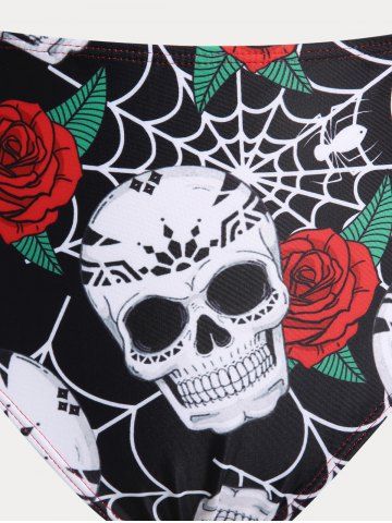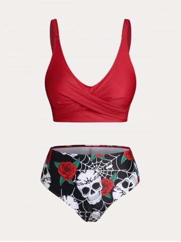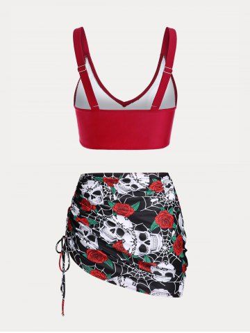 Plus Size & Curve Skull Rose Print Crossover Three Piece Bikini Swimsuit - Multi - 1x