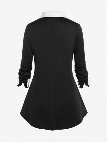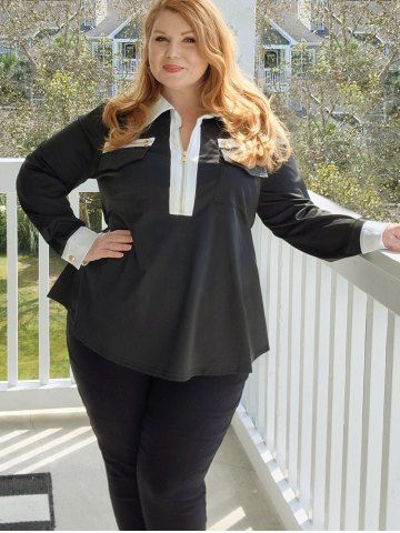 Plus Size Blouses > Plus Size Contrast Turndown Collar Half Zipper Flap Pocket T-shirt