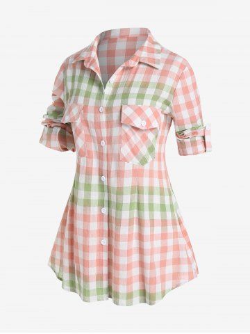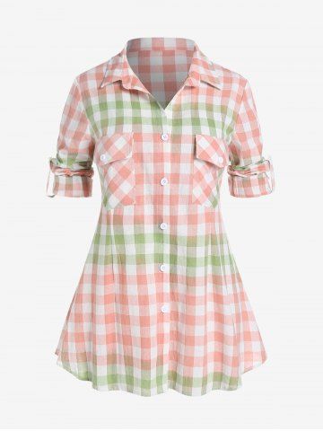Plus Size Blouses > Plus Size Roll Up Sleeve Colorblock Pockets Plaid Shirt