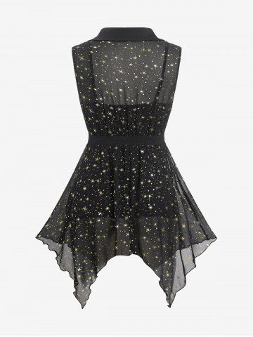 a*****74Plus Size Stars Printed Heart Buckle Buttons Sheer BlouseColor: BLACK Size: L | US 12It looks amazing! It fits pretty well, it's a two piece outfit and really nice. Nice fabric and looks exactly like the picture!