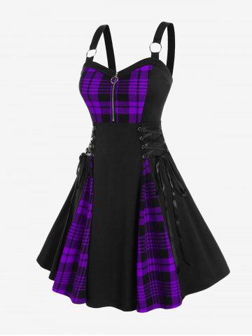 Casual Dresses > Gothic Plus Size Plaid Colorblock Print Lace Up Half Zipper Patchwork Fit and Flare Dress