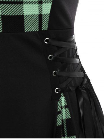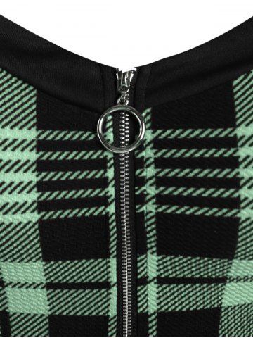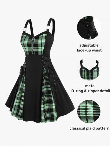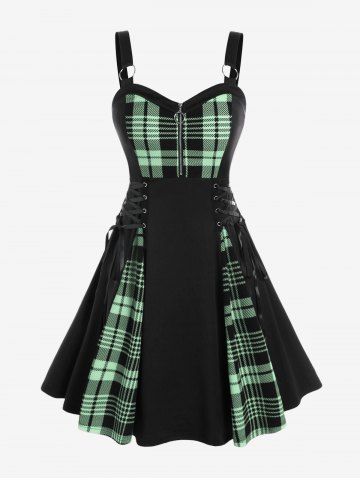 Gothic Plus Size Plaid Colorblock Print Lace Up Half Zipper Patchwork Fit and Flare Dress - Light Green - M | Us 10