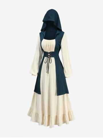 Gothic Plus Size Two Tone Textured Lace Up Hooded 2 in 1 Long Sleeves A Line Dress - Deep Green - L | Us 12