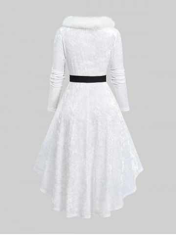 Plus Size Buttons Fleece Neck Long Sleeve Velvet High Low Dress With Belt - White - S | Us 8