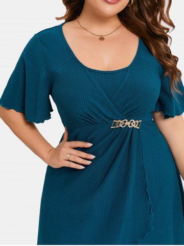 h*****i4Plus Size Chain Panel Ruched Layered Lettuce Trim Surpliced DressColor: DEEP BLUE Size: 3X | US 22-24my mesurements: 44D bust, 56in belly, 30in length. nthis dress will need leggings, do not bend over unless u like to show offnwas EXACTLY what I was looking for!