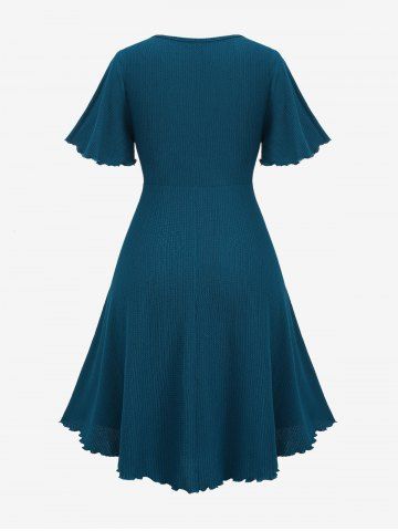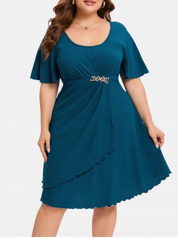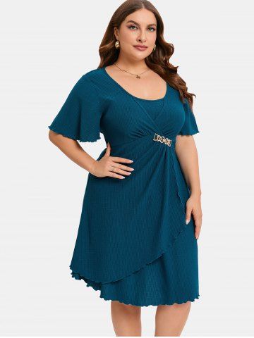 Plus Size Chain Panel Ruched Layered Lettuce Trim Surpliced Dress - Deep Blue - 5x | Us 30-32