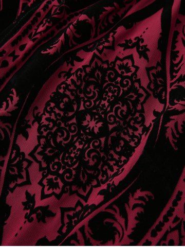 Plus Size Cold Shoulder Flare Sleeve Flower Flocking Belted High Low Asymmetric Dress - Deep Red - 1x | Us 14-16