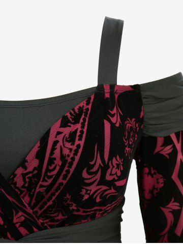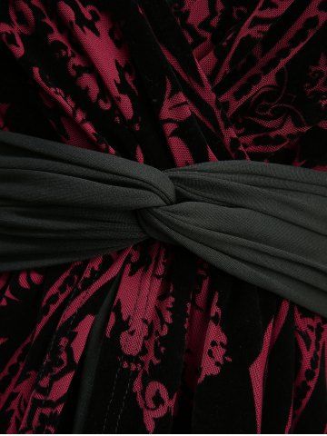 Plus Size Cold Shoulder Flare Sleeve Flower Flocking Belted High Low Asymmetric Dress - Deep Red - 2x | Us 18-20