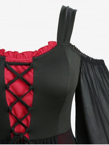Plus Size Cold Shoulder Flare Sleeve Lace Up Chiffon Textured Two Tone High Low Asymmetric Dress - Red - 4x | Us 26-28