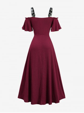 Plus Size Cold Shoulder Flower Embroidered Lace Up Ruched Split Corset A Line Textured Dress - Deep Red - 2x | Us 18-20