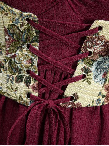 Plus Size Cold Shoulder Flower Embroidered Lace Up Ruched Split Corset A Line Textured Dress - Deep Red - 3x | Us 22-24