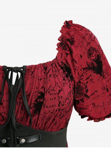 Plus Size Flowers Flocking Tie Ruched Ruffles Corset Waist Dress - Deep Red - 4x | Us 26-28
