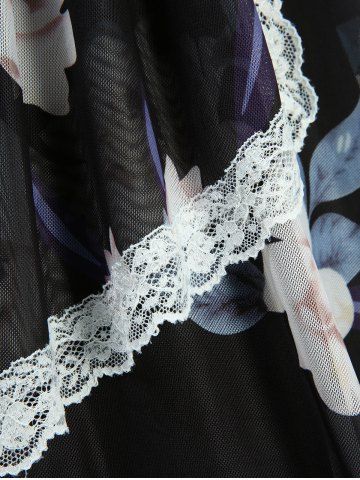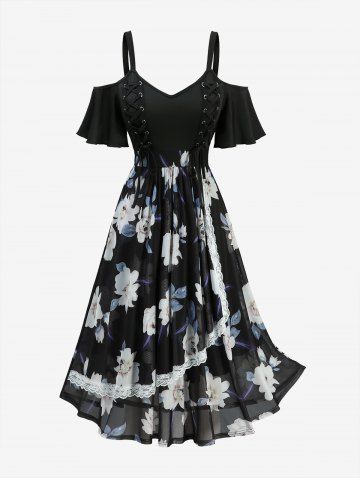 Plus Size Flowers Leaf Print Lace-up Grommets Lace Trim Cold Shoulder Tank Dress - Black - L | Us 12