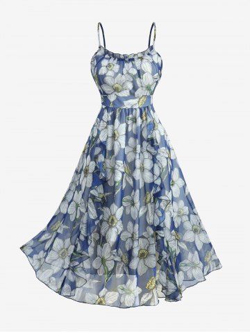 Plus Size Flowers Leaf Print Ruffles Cami Dress With Grommets Lace Up Marled Ribbed Top - Deep Blue - L | Us 12